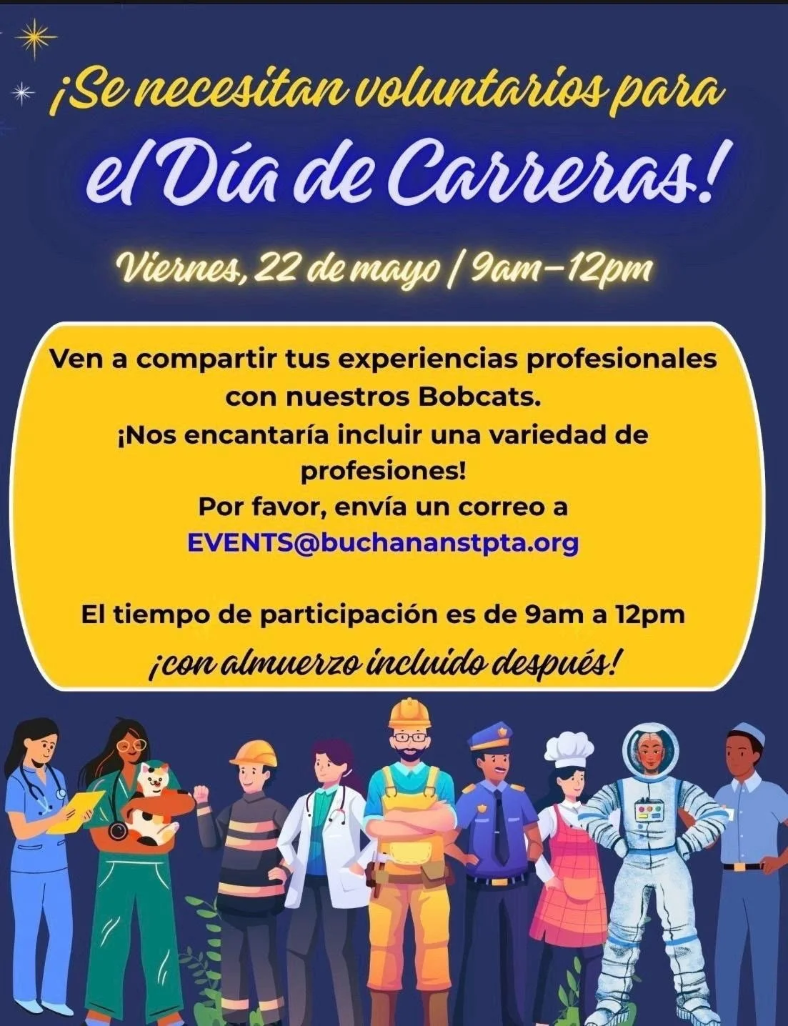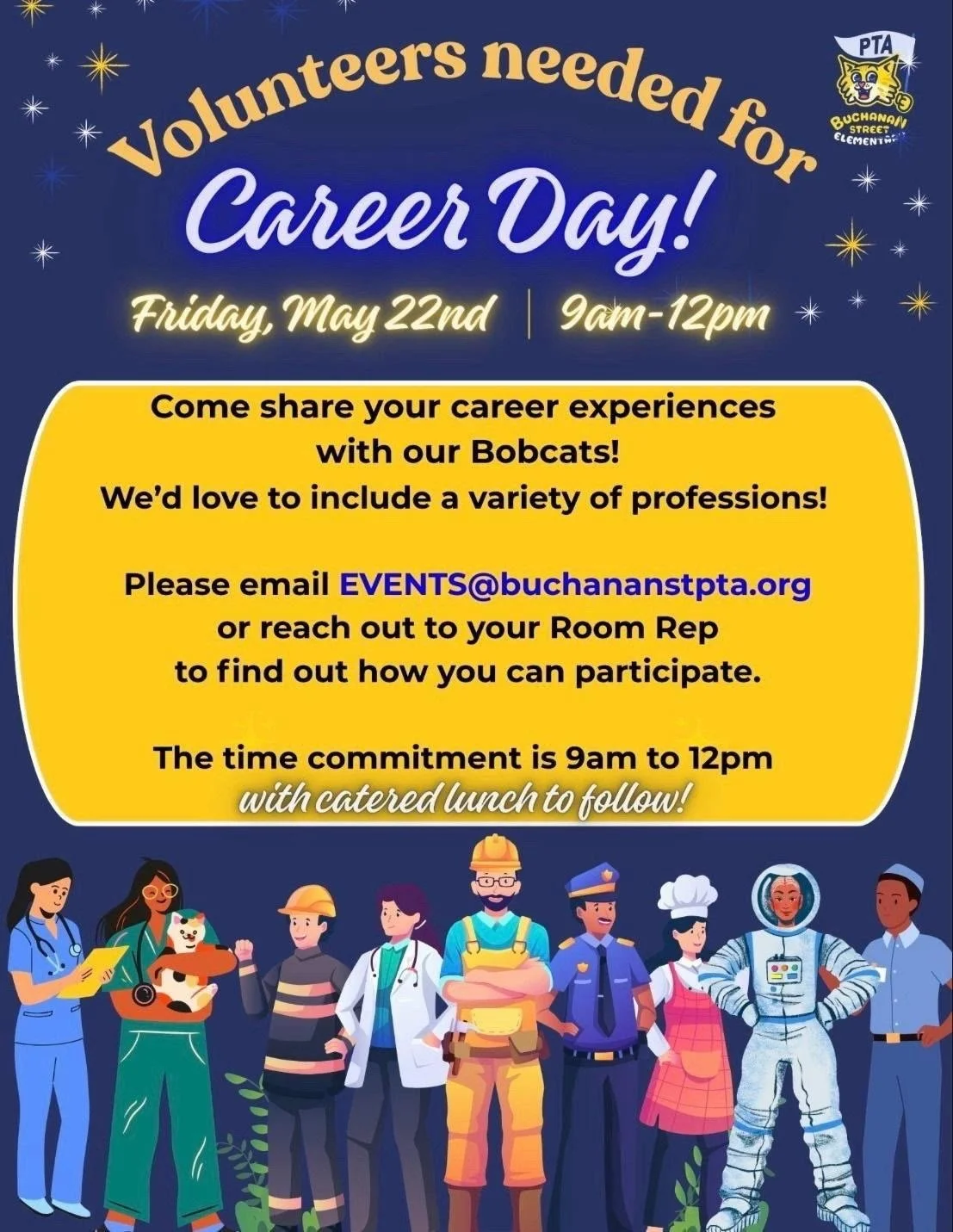 Astronaut, doctor, scientist, electrician --- send your kids to school dressed as a profession they dream of being one day! If any parents are interested in volunteering to talk about their career, please email EVENTS@buchananstpta.org.