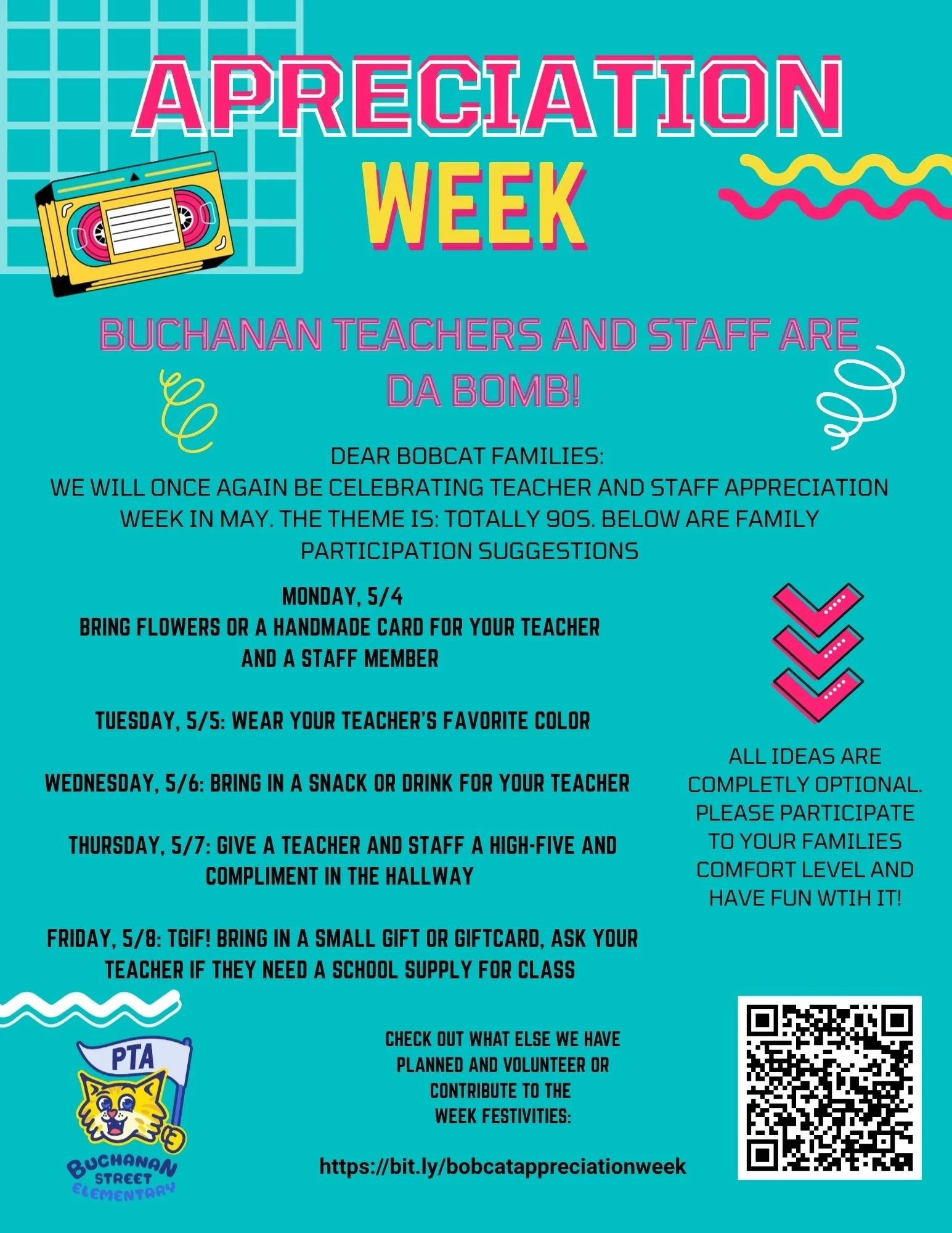 See the flyer below for ways to show our teachers and staff that we love them! Sign up here for volunteer/contribution opportunities at bit.ly/bobcatappreciationweek